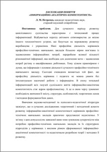 - Петренко, Лариса Михайлівна (2012) Explication of the meaning "informational-analitical competence" Наукові праці Державної науково-педагогічної бібліотеки України імені В. О. Сухомлинського. Науково-методичні та організаційні засади інформаційно-аналітичного забезпечення педагогічної науки, освіти і практики України: стан та перспективи (3). pp. 70-79.