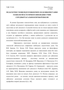- Кутова, О.М. (2011) Педагогічні умови підготовки вчителя до використання технологій естетичного виховання учнів середньої загальноосвітньої школи Освіта дорослих: теорія, досвід, практика, 3 (3). pp. 243-252.