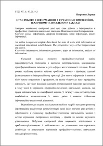 - Петренко, Лариса Михайлівна (2011) Состояние работы с информацией в современном профессионально-техническом учебном заведении In: Система підвищення функціональної компетентності керівників професійно-технічних навчальних закладів: матеріалі науково-практичного семінару . Інститут професійно-технічної освіти НАПН України, м.Київ, Україна, pp. 129-132.