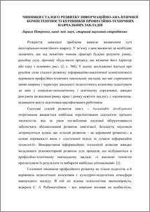 - Петренко, Лариса Михайлівна (2011) Чинники сталого розвитку інформаційно-аналітичної компетентності керівників професійно-технічних навчальних закладів In: Система роботи ПТНЗ з формування професійно-мобільного кваліфікованого робітника : матеріали Всеукраїнської науково-практичної конференції . Інститут професійно-технічної освіти НАПН України, Кривий Ріг, pp. 103-104.