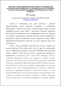 - Савченко, Ірина (2012) Dynamics of trends retraining and advanced training of the unemployed and the working population in VET by means of information-analytical system of vocational training In: Науково-методичні основи професійного навчання дорослих в умовах ПТНЗ і виробництва . Львівський науково-практичний центр професійно-технічної освіти НАПН України, м.Львів, Україна, pp. 91-93. ISBN 978-966-665-773-0