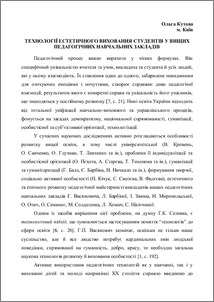 Важко знайти в історії людства таку епоху, в якій естетичне виховання не було б складовою частиною виховної роботи з учнями та студентами. Нині в Україні відбувається процес гуманізації освіти, в якому теж відводиться важливе місце естетичному вихованню. Отже, використання педагогами технологій естетичного виховання студентів сприяли б цілеспрямованому формуванню творчої активної особистості. Лише необхідна педагогічна майстерність викладача для ненав’язливого втілення технологій естетичного виховання у навчально-виховний процес вищого педагогічного навчального закладу.