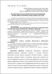 - Петренко, Лариса Михайлівна (2013) Vocational school leaders' pedagogical reflection diagnostics Молодь і ринок , 11 (106). pp. 42-46. ISSN 2308-46-34