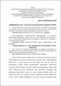 - Вовковінський, М.І. (2011) Professional success - the constituent of work of leader VTS is important In: Система підвищення функціональної компетентності керівників ПТНЗ (1). Інститут професійно-технічної освіти НАПН України, м.Київ, Україна, pp. 34-36.