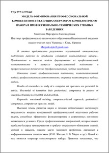 - Мілохіна, М.О. (2013) Модель формирования профессиональной компетентности будущих операторов компьютерного набора в профессионально-технических учебных заведениях Профессиональное образование в современном мире, 3 (10). pp. 92-97. ISSN 2224-1841