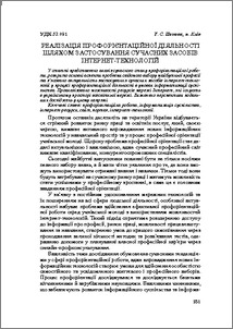 An analysis of the current state of career guidance is done in this article. The main aspects of the problem of conscious choice of future profession are disclosed, the urgency of using modern means of internet-technologies in the process of career guidance activities under conditions of informatization of society is clarified. Attention is paid to the major drawbacks of the organization of vocational guidance work in educational institutions, leading to the necessity of improvement of the contents and methods of vocational guidance. The basic classifications of internet resources according to the analysis of recent research and publications on this topic are also given. The possibilities of network resources which exist in the Ukrainian space of the world network are analized. It is found out that the Internet allows solving various problems concerning the organization of vocational work: you can take career-oriented testing, get recommendations on priority occupations and assistance in determining the right choice of professional career and youth employment, study sites, which provide the description of occupations. This work underlines that the implementation of network resources in the process of vocational guidance helps to activate the interest of self-acquaintance with modern occupations, to find information about the demands and needs in staff, to determine own physiological characteristics, abilities and aptitudes to certain activities. The prospects for further research in this direction are determined.