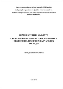 Методичний посібник підготовлено за матеріалами експериментальної роботи щодо проблеми формування і розвитку комунікативної культури суб’єктів навчально-виховного процесу професійно-технічних навчальних закладів, здійсненого на базі Дніпродзержинського центру підготовки і перепідготовки робітничих кадрів Дніпропетровської області. На сторінках посібника знайшли відображення теоретичні основи управління формуванням та розвитком культури суб’єктів навчально-виховного процесу ПТНЗ, організаційно-педагогічні та методичні аспекти забезпечення експериментальної роботи в умовах реального функціонування професійно-технічного навчального закладу.