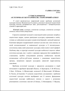 - Сотська, Г.І. (2013) The essence of the concept of "aesthetic culture teacher": theoretical aspects Імідж сучасного педагога, 7 (136). pp. 28-31. ISSN 2221-6316