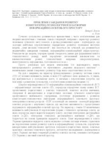Informatization of Education is directed on constant improve the quality of education ensuring the youth’ competitiveness in the global economic market. This process involves the implementation of the open education principles. It is characterized by significant targeted and content technological changes that take place systematic in educational systems both at the level computer-oriented learning tools, their sets and systems, and on the level of ICT tools and support the educational process. It is found out and proved that the main purpose of further development of education should be providing individual trajectory of formation and development of the creative individual student. There are singled out tasks of computer-technology platform of perspective development for information and educational environment.