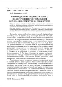- Бернацька, О.Б. (2009) Впровадження індивідуального плану розвитку як технології виховання самостійної особистості Теоретико-методичні проблеми виховання дітей та учнівської молоді: збірник наукових праць, 1 (13). pp. 121-129. ISSN ISBN: 978-966-2903-36-2