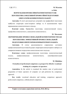 - Мілохіна, М.О. (2012) Formation of professional competence as prospect for effective vocational training of a computer set operators The Theory and Methods of Educational Management, 1 (8). ISSN 2310-2411