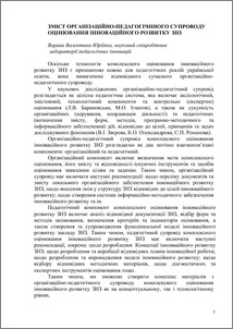 Організаційно-педагогічний супровід комплексного оцінювання інноваційного розвитку ЗНЗ автор розглядає як два логічно взаємопов’язані компоненти: організаційний та педагогічний.