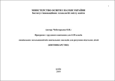 Чеботарьова, О. В. (orcid.org/0000-0002-4560-3708) (2010) Programs of labor education for grades 4-10 of secondary special schools for mentally retarded children (Floristry) . ВАТ "Поліграфкнига", м.Київ, Україна.
