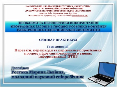 - Ростока, Марина Львівна (2014) Переваги, перешкоди та перспективи протікання процесу підручникотворення в умовах інформатизації ПТНЗ In: Семінар-практикум "Проблеми та перспективи використання програмних засобів в процесі розробки контенту електронного підручника для системи ПТО". Підтема НДР: "Аналіз стану проблеми підручникотворення в умовах інформатизації профтехосвіти", 10 квітнія 2014 року, Інститут професійно-технічної освіти НАПН України. (Submitted)
