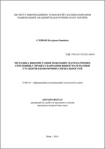 - Словак, К. І. (orcid.org/0000-0003-4012-8386) (2011) Methodic of using mobile mathematical environments in the process of education higher mathematics of student of economic specialties. Dissertation candidate2 thesis, Інститут інформаційних технологій і засобів навчання.