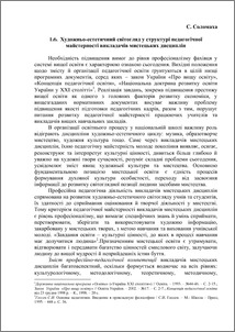 n Section " Art and the aesthetic worldview of the structure of the pedagogical skills of teachers of artistic disciplines " S. Solomacha substantiated that the specific teaching activities of teachers of artistic disciplines is the work of a literary text , which has a strong educational and ideological potential. It is manifested in search of the meaning of a work of art when not only acquired some artistic skills , and performed rethinking personal position on artistic and aesthetic , moral and ethical values, ideals and beliefs. By finding meanings of symbols in the texts of culture , according to the researcher carried out the culture of teacher and student culture , student, researcher combines logic with artistic and aesthetic imagery of the artist.