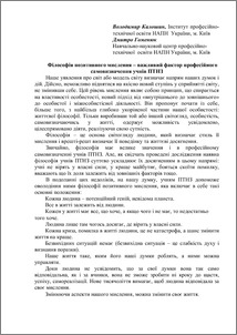- Калошин, В.Ф. and Гоменюк, Д.В. (2012) Philosophy of positive thinking - an important factor in professional self- vocational school students In: Наукове-методичне забезпечення професійної освіти і навчання: Матеріали Звітної науково-практичної конференції (29 квітня 2012) . ІПТО НАПН України, м.Київ, Україна, pp. 61-62.