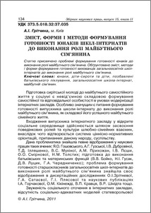 - Грітчина, А.І. (2011) Зміст, форми і методи формування готовності юнаків шкіл-інтернатів до виконання ролі майбутнього сім’янина Теоретико-методичні проблеми виховання дітей та учнівської молоді: 3б. наук. праць,, 2 (15). pp. 134-141. ISSN 978-617-620-016-1
