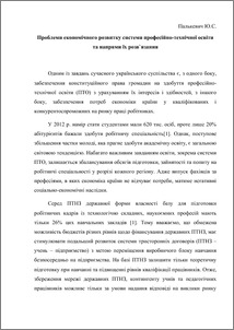 - Палькевич, Юлія Святославівна (2013) Problems of economic development of vocational education and ways of their solving In: Social partnership as a tool to update the content of vocational education , 1 (1). Institute of Vocational Education, м. Кривий Ріг, Україна.