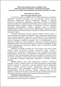 The problem of corruption acts a barrier to economic development of the Ukrainian state and political instability factor of the Ukrainian society. So, it's the relevance of elective courses students "My civic consciousness . Preventing corruption " due to the fact that. In the situation of deepening social, political and economic crisis , corruption becomes a threat to the national security of Ukraine, affects the efficiency of public administration, the functioning of public authorities and local governments, undermining the foundations of the established order, protection of rights and freedoms. These phenomena and processes of concern to society and citizens in Ukraine .
