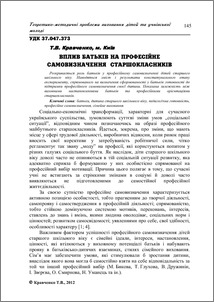 - Кравченко, Т.В. (2012) Вплив батьків на професійне самовизначення старшокласників Теоретико-методичні проблеми виховання дітей та учнівської молоді, 1 (16). pp. 143-153. ISSN ISBN 978-966-7406-72-1