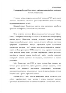 - Палькевич, Юлія Святославівна (2014) Stages of development of a business plan supervisor vocational school На допомогу керівникові професійно-технічного навчального закладу, 1 (5).