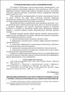 У статті висвітлюються аспекти виховання фізичної культури учнів початкових класів у процесі позакласної роботи загальноосвітньої школи.