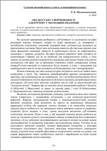 - Малиношевський, Р.В. (2013) Анализ состояния сформированности альтруизма у младших подростков In: Сучасний виховний процес: сутність та інноваційний потенціал Матеріали звіт. наук.-практ. конф. Ін-ту проблем виховання НАПН України за 2012 рік , 3 (3). НАІР, м. Івано-Франківськ, Україна, pp. 150-152.