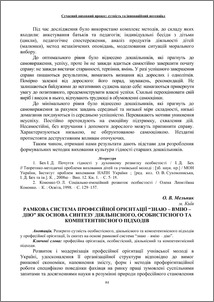 - Мельник, О.В. (2012) Рамкова система професійної орієнтації “знаю – вмію – дію” як основа синтезу діяльнісного, особистісного та компетентнісного підходів In: Сучасний виховний процес: сутність та інноваційний потенціал (2). Типовіт, м.Івано-Франківськ, Україна, pp. 84-87.