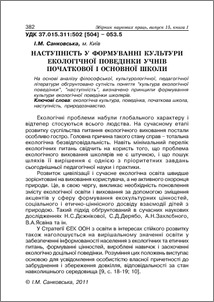 - Санковська, Ірина Мечиславівна (2011) Наступність у формуанні культури екологічної поведінки учнів початкової і основної школи Теоретико-методичні проблеми виховання дітей та учнівської молоді, 1 (15). pp. 382-388. ISSN 978-617-620-015-4
