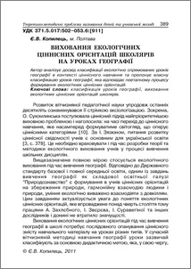- Копилець, Євген Вікторович (2011) Виховання екологічних ціннісних орієнтацій школярів на уроках географії Теоретико-методичні проблеми виховання дітей та учнівської молоді, 1 (15). pp. 389-397. ISSN 978-617-620-015-4