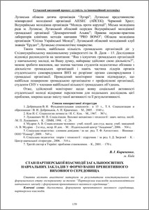 - Кириченко, В. І. (2013) Cтан партнерської взаємодії загальноосвітніх навчальних закладів у формуванні превентивного виховного середовища In: Сучасний виховний процес: сутність та інноваційний потенціал: матеріали звіт. наук.-практ. конф. (3). НАІР, м. Івано-Франківськ, Україна, pp. 139-143.