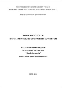Методичні рекомендації розроблено для студентiв денної форми навчання з усіх спецiальностей. Запропонований матерiал сприятиме студентам у вивченні навчального курсу “Конфліктологія”, пiдготовцi до практичних занять та підсумкового контролю знань. Крім того, він допоможе майбутнім спеціалістам у попередженні та подоланні життєвих і виробничих конфліктів, ознайомить їх із методами саморегуляції власного емоційного стану у конфліктних ситуаціях, що допоможе їм оволодіти та керувати конфліктами. Змiст методичних рекомендацій складається з тематичного і календарного планів; навчальної програми курсу; плану практичних занять; програми самостійної роботи студентів з вивчення курсу; тематики рефератів з методичними рекомендаціями щодо їх написання; питань до заліку, а також списку рекомендованої літератури. Окремий розділ присвячено викладу основних понять конфліктології.