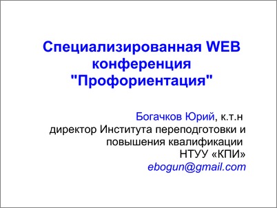 - Богачков, Ю.М. (2010) Спеціалізована WEB конференція "Профорієнтація" In: Тиждень освіти дорослих.
