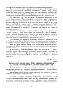 Розкрито роль батьків у професійному самовизначенні дітей старшого шкільного віку; наведено зміст і результати визначення сформованості у батьків готовності до підтримки професійного самовизначення своєї дитини.