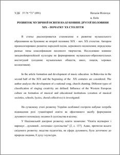 - Філіпчук, Н.О. (2009) Розвиток музичної освіти на Буковині другої половини ХІХ – початку ХХ століття Мистецька освіта: зміст, технології, менеджмент (4). pp. 35-43.