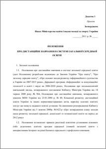 Положення про дистанційне навчання в системі загальної середньої освіти Положення встановлює правила реалізації освітніми установами основних і/або додаткових освітніх програм середньої (повної) загальної освіти з використанням Інтернет на рівні базового середнього і профільного навчання.