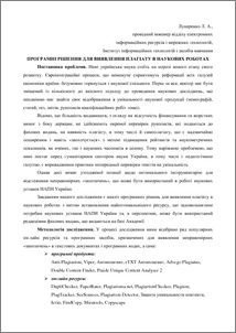 Нині українська наука стоїть на порозі нового етапу свого розвитку. Євроінтеграційні процеси, що неминуче сприятимуть реформації всіх галузей економіки країни, безумовно торкнуться і наукової спільноти. Перш за все, вектор має бути зміщений із кількісного до якісного підходу до проведення наукових досліджень, що неодмінно має знайти своє відображення в унікальності наукової продукції (монографій, статей, тез, звітів, рукописів кваліфікаційних робіт тощо). Відомо, що більшість видавництв, з огляду на відсутність фінансування та жорстких вимог з боку держави, не здійснюють окремої перевірки рукописів, які подаються до фахових видань, на наявність плагіату, в тому числі й самоплагіату, що є надзвичайно поширеним і навіть «заохочується» з метою підвищення рейтингів та наукометричних показників, як вчених, так і наукових часописів в цілому. Тому наріжною проблемою, що нині постає перед гуманітарним сектором науки України, в тому числі і педагогічною галуззю, є впровадження практики попередньої перевірки текстів на унікальність. Однак досі немає узгодженої позиції щодо оптимального інструментарію для відстеження неправомірних «запозичень», що може бути використаний в роботі наукових установ НАПН України. Завданням нашого дослідження є аналіз програмних рішень для виявлення плагіату в наукових роботах з метою встановлення найоптимальнішого ресурсу, що задовольнятиме потребам наукових установ НАПН України та, в перспективі, може бути використаний редакціями фахових видань, що видаються на базі Академії.