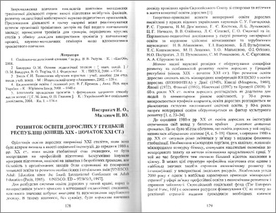 - Постригач, Н.О. and Малевич, Н.Ю. (2013) Development of Adult Education in Greece (the end of the nineteenth and beginning of the twenty-first century.) In: Modern trends in adult education in the European Матеріали Міжнародної науково-практичної конференції (1). Cherkasy National University named after Bogdan Khmelnitsky, м.Черкаси, Україна, pp. 128-132. ISBN 978-966-97302-2-0