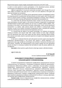 The peculiarities of professional self-determination of rural girls of senior school age are following: the compliance of the gender approach to organizational-methodological providing of school work to the preparation of a rural family for professional selfdetermination of rural girls of senior school age; consideration of the interests, aptitudes and abilities of rural girls of senior school age; appreciation of features of modern rural families concerning their residence. The outlined aspects are considered in the context of the interaction of rural school and family as the most important social institutions in forming of the personality particularly in professional self-determination of girls of senior age. Special attention is paid to consideration of gender peculiarities as one of the important factors that determines the content of professional self-determination. This article has indicated the area of new problems which are solved in the interaction of rural school with family, namely in teachers’ work with the family that should focus on the implementation of psychological support to parents in the upbringing through «dialogical communication», especially singled out the need to worry about personal growth both pupils and their parents. All this contributes to the establishment of constructive relationships between students and their parents in finding effective forms of assistance that would provide their needs for professional self-determination. Solving the problem of interaction between family and school to professional selfdetermination of girls of senior school age, the article outlines the following items: human interaction is a process which is based on the objective socio-psychological mechanisms. The most important of them are: the exchange of information by interacting parties and activities, taking into consideration the unevenness of this interaction (school is more active in improving pedagogical culture of parents than family), and the interdependence of changes that occur in each of the parties. The content and forms of interaction depend on the specific socio-demographic conditions as well as the objectives and goals that school and family are facing at this point. The article proves that self-determination of rural girls of senior school age is carried out in the specific conditions of the rural environment, which greatly influences this process. In rural educational institutions is accumulated the experience of pedagogical conditions that promote self-determination of students in both career and independent life in the future. Obtained results confirm the assumption about the differences between boys and girls in the professional interests, aptitudes, motivation, achievement and should be considered when organizing work with pupils on problem of their professional self-determination.