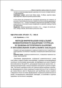 - Корнієнко, А.В. (2010) Методи формування соціальної компетентності підлітків у гуртках художньо-естетичного напряму у позашкільних навчальних закладах Теоретико-методичні проблеми виховання дітей та учнівської молоді, 1 (14). pp. 174-182. ISSN ISBN 978-966-189-055-7