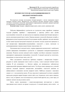 Розглядається питання застосування Інтернет-ресурсів з метою підвищення якості шкільної хімічної освіти. Відмічається, що розвиток системи шкільної освіти потребує постійного оновлення технологій, прискореного впровадження інновацій, швидкої адаптації до економічних та технологічних змін у світі.