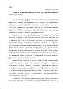 - Радкевич, В.О. (2010) The methodological culture development of teachers in professional technical establishments Професійна освіта: проблеми і перспективи, 1 (1). pp. 133-138.