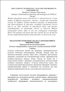 Modern educational theory and practice is characterized by a large number of different approaches , theories , schools and educational systems. In addition, Ukraine declared principles of humanization and democratization of education, variability educational process and so on. Also currently in educational theory and practice technologization of educational process is observed. Modern pedagogical science offers to use new pedagogical technologies along with methods and means that have passed the test of time for the successful implementation of the principles set forth by the state.