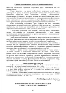 - Маринич, В.Л. and Шафаренко , О.В. (2013) Виховний простір як засіб формування компетентностей гуртківців In: Сучасний виховний процес: сутність та інноваційний потенціал // Матеріали наук.-практ. конференції (за результатами науково-дослідної роботи Інституту проблем виховання НАПН України в 2011 р. (3). НАІР, м. Івано-Франківськ, Україна, pp. 455-458.