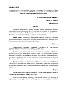 - Піроженко, Тамара Олександрівна (2011) Continuation of scientific traditions of V. Kotirlo is in modern activity of laboratory of psychology of preschool child Збірник наукових праць Інституту психології імені Г.С. Костюка НАПН України, Том IV (7). pp. 6-19. ISSN 2072-4772