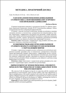 - Вавіна, Л.С. (2013) Improvement of senior preschool children’s speech in the process of familiarization with the environment Дитина із сенсорними порушеннями: розвиток, навчання, виховання, 1 (4). pp. 93-103.