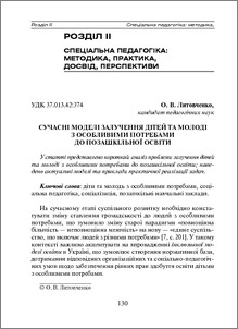 - Литовченко, О.В. (2013) Сучасні моделі залучення дітей та молоді з особливими потребами до позашкільної освіти Актуальні проблеми навчання та виховання людей з особливими потребами, 10 (12). pp. 130-139.