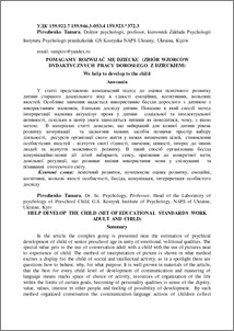 - Піроженко, Тамара Олександрівна (2014) Help develop the child (set of educational standards work adult and child) Technologies of intellect development, 1 (5). pp. 11-24. ISSN 2223-0521
