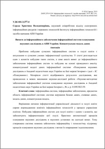 - Середа, Х.В. (orcid.org/0000-0002-4510-7173) (2010) Requirements to information supply of planning information system of scientific researches in APS of Ukraine. Conceptual data model Інформаційні технології і засоби навчання, 2 (16). ISSN 2076-8184